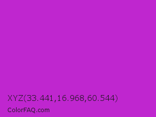 XYZ 33.441,16.968,60.544 Color is a normal magenta color and the nearest color is Steel Pink #cc33cc. Hex code #bf26cf and RGB value is rgb(191,38,207). In RGB color space, this color is composed of 75% red, 15% green, 81% blue, In CMYK color space, this color is composed of 8% cyan, 82% magenta, 0% yellow , 19% black , In HSL color space, this color has a hue angle of 294° , 69% saturation and 48% lightness.