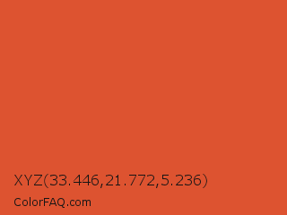 XYZ 33.446,21.772,5.236 Color is a normal red color and the nearest color is Flame Pea #da5b38. Hex code #dd5330 and RGB value is rgb(221,83,48). In RGB color space, this color is composed of 87% red, 33% green, 19% blue, In CMYK color space, this color is composed of 0% cyan, 62% magenta, 78% yellow , 13% black , In HSL color space, this color has a hue angle of 12° , 72% saturation and 53% lightness.