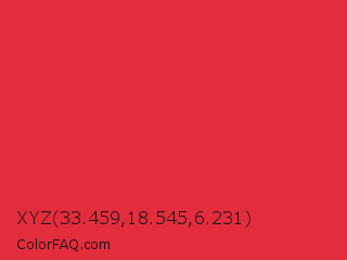 XYZ 33.459,18.545,6.231 Color is a normal red color and the nearest color is Alizarin Crimson #e32636. Hex code #e32d3d and RGB value is rgb(227,45,61). In RGB color space, this color is composed of 89% red, 18% green, 24% blue, In CMYK color space, this color is composed of 0% cyan, 80% magenta, 73% yellow , 11% black , In HSL color space, this color has a hue angle of 355° , 76% saturation and 53% lightness.