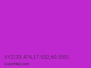 XYZ 33.474,17.032,60.555 Color is a normal magenta color and the nearest color is Steel Pink #cc33cc. Hex code #bf27cf and RGB value is rgb(191,39,207). In RGB color space, this color is composed of 75% red, 15% green, 81% blue, In CMYK color space, this color is composed of 8% cyan, 81% magenta, 0% yellow , 19% black , In HSL color space, this color has a hue angle of 294° , 68% saturation and 48% lightness.