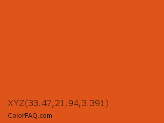 XYZ 33.47,21.94,3.391 Color is a normal orange color and the nearest color is Flame #e25822. Hex code #de5419 and RGB value is rgb(222,84,25). In RGB color space, this color is composed of 87% red, 33% green, 10% blue, In CMYK color space, this color is composed of 0% cyan, 62% magenta, 89% yellow , 13% black , In HSL color space, this color has a hue angle of 18° , 80% saturation and 48% lightness.
