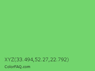 XYZ 33.494,52.27,22.792 Color is a light green color and the nearest color is Pastel Green #77dd77. Hex code #72d56d and RGB value is rgb(114,213,109). In RGB color space, this color is composed of 45% red, 84% green, 43% blue, In CMYK color space, this color is composed of 46% cyan, 0% magenta, 49% yellow , 16% black , In HSL color space, this color has a hue angle of 117° , 55% saturation and 63% lightness.
