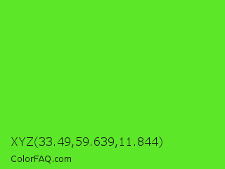 XYZ 33.49,59.639,11.844 Color is a normal green color and the nearest color is Harlequin Green #46cb18. Hex code #5de729 and RGB value is rgb(93,231,41). In RGB color space, this color is composed of 36% red, 91% green, 16% blue, In CMYK color space, this color is composed of 60% cyan, 0% magenta, 82% yellow , 9% black , In HSL color space, this color has a hue angle of 104° , 80% saturation and 53% lightness.