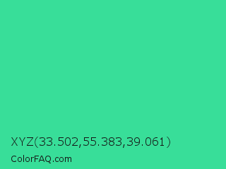 XYZ 33.502,55.383,39.061 Color is a normal green color and the nearest color is Shamrock #33cc99. Hex code #38de99 and RGB value is rgb(56,222,153). In RGB color space, this color is composed of 22% red, 87% green, 60% blue, In CMYK color space, this color is composed of 75% cyan, 0% magenta, 31% yellow , 13% black , In HSL color space, this color has a hue angle of 155° , 72% saturation and 55% lightness.