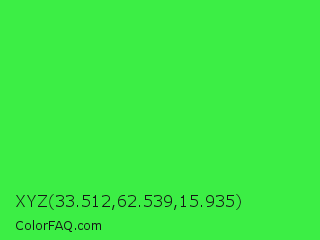 XYZ 33.512,62.539,15.935 Color is a normal green color and the nearest color is Lime Green #32cd32. Hex code #3cee45 and RGB value is rgb(60,238,69). In RGB color space, this color is composed of 24% red, 93% green, 27% blue, In CMYK color space, this color is composed of 75% cyan, 0% magenta, 71% yellow , 7% black , In HSL color space, this color has a hue angle of 123° , 84% saturation and 58% lightness.