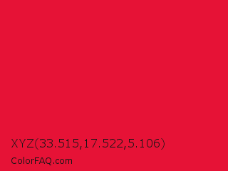 XYZ 33.515,17.522,5.106 Color is a normal red color and the nearest color is Crimson #dc143c. Hex code #e61236 and RGB value is rgb(230,18,54). In RGB color space, this color is composed of 90% red, 7% green, 21% blue, In CMYK color space, this color is composed of 0% cyan, 92% magenta, 77% yellow , 10% black , In HSL color space, this color has a hue angle of 350° , 85% saturation and 49% lightness.