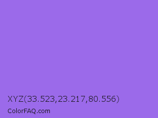 XYZ 33.523,23.217,80.556 Color is a light violet color and the nearest color is Medium Purple #9370db. Hex code #9b6aea and RGB value is rgb(155,106,234). In RGB color space, this color is composed of 61% red, 42% green, 92% blue, In CMYK color space, this color is composed of 34% cyan, 55% magenta, 0% yellow , 8% black , In HSL color space, this color has a hue angle of 263° , 75% saturation and 67% lightness.