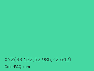 XYZ 33.532,52.986,42.642 Color is a normal green color and the nearest color is Eucalyptus #44d7a8. Hex code #45d8a2 and RGB value is rgb(69,216,162). In RGB color space, this color is composed of 27% red, 85% green, 64% blue, In CMYK color space, this color is composed of 68% cyan, 0% magenta, 25% yellow , 15% black , In HSL color space, this color has a hue angle of 158° , 65% saturation and 56% lightness.