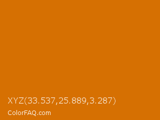 XYZ 33.537,25.889,3.287 Color is a normal orange color and the nearest color is Bamboo #da6304. Hex code #d67002 and RGB value is rgb(214,112,2). In RGB color space, this color is composed of 84% red, 44% green, 1% blue, In CMYK color space, this color is composed of 0% cyan, 48% magenta, 99% yellow , 16% black , In HSL color space, this color has a hue angle of 31° , 98% saturation and 42% lightness.