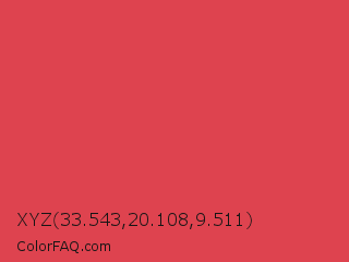 XYZ 33.543,20.108,9.511 Color is a normal red color and the nearest color is Desire #ea3c53. Hex code #de434f and RGB value is rgb(222,67,79). In RGB color space, this color is composed of 87% red, 26% green, 31% blue, In CMYK color space, this color is composed of 0% cyan, 70% magenta, 64% yellow , 13% black , In HSL color space, this color has a hue angle of 355° , 70% saturation and 57% lightness.