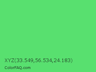 XYZ 33.549,56.534,24.183 Color is a light green color and the nearest color is Emerald #50c878. Hex code #58e06f and RGB value is rgb(88,224,111). In RGB color space, this color is composed of 35% red, 88% green, 44% blue, In CMYK color space, this color is composed of 61% cyan, 0% magenta, 50% yellow , 12% black , In HSL color space, this color has a hue angle of 130° , 69% saturation and 61% lightness.
