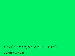 XYZ 33.558,63.279,23.016 Color is a normal green color and the nearest color is Spring Green #00ff7f. Hex code #00f066 and RGB value is rgb(0,240,102). In RGB color space, this color is composed of 0% red, 94% green, 40% blue, In CMYK color space, this color is composed of 100% cyan, 0% magenta, 58% yellow , 6% black , In HSL color space, this color has a hue angle of 146° , 100% saturation and 47% lightness.