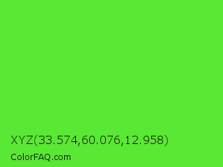 XYZ 33.574,60.076,12.958 Color is a normal green color and the nearest color is Harlequin Green #46cb18. Hex code #59e833 and RGB value is rgb(89,232,51). In RGB color space, this color is composed of 35% red, 91% green, 20% blue, In CMYK color space, this color is composed of 62% cyan, 0% magenta, 78% yellow , 9% black , In HSL color space, this color has a hue angle of 107° , 80% saturation and 55% lightness.