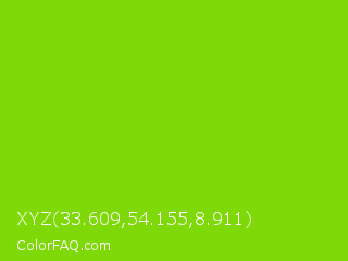 XYZ 33.609,54.155,8.911 Color is a normal green color and the nearest color is Alien Armpit #84de02. Hex code #7fd908 and RGB value is rgb(127,217,8). In RGB color space, this color is composed of 50% red, 85% green, 3% blue, In CMYK color space, this color is composed of 41% cyan, 0% magenta, 96% yellow , 15% black , In HSL color space, this color has a hue angle of 86° , 93% saturation and 44% lightness.