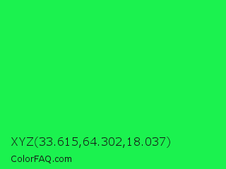 XYZ 33.615,64.302,18.037 Color is a normal green color and the nearest color is Malachite #0bda51. Hex code #1bf24f and RGB value is rgb(27,242,79). In RGB color space, this color is composed of 11% red, 95% green, 31% blue, In CMYK color space, this color is composed of 89% cyan, 0% magenta, 67% yellow , 5% black , In HSL color space, this color has a hue angle of 135° , 89% saturation and 53% lightness.