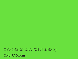 XYZ 33.62,57.201,13.826 Color is a normal green color and the nearest color is Kiwi #8ee53f. Hex code #69e13e and RGB value is rgb(105,225,62). In RGB color space, this color is composed of 41% red, 88% green, 24% blue, In CMYK color space, this color is composed of 53% cyan, 0% magenta, 72% yellow , 12% black , In HSL color space, this color has a hue angle of 104° , 73% saturation and 56% lightness.