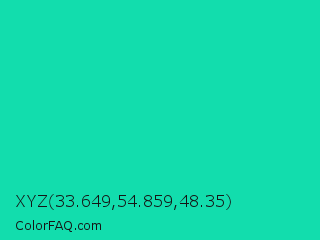 XYZ 33.649,54.859,48.35 Color is a normal cyan color and the nearest color is Amazonite #00c4b0. Hex code #12ddad and RGB value is rgb(18,221,173). In RGB color space, this color is composed of 7% red, 87% green, 68% blue, In CMYK color space, this color is composed of 92% cyan, 0% magenta, 22% yellow , 13% black , In HSL color space, this color has a hue angle of 166° , 85% saturation and 47% lightness.
