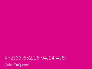 XYZ 33.652,16.94,24.418 Color is a normal magenta color and the nearest color is Mexican Pink #e4007c. Hex code #db0687 and RGB value is rgb(219,6,135). In RGB color space, this color is composed of 86% red, 2% green, 53% blue, In CMYK color space, this color is composed of 0% cyan, 97% magenta, 38% yellow , 14% black , In HSL color space, this color has a hue angle of 324° , 95% saturation and 44% lightness.