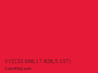 XYZ 33.668,17.828,5.157 Color is a normal red color and the nearest color is Alizarin Crimson #e32636. Hex code #e61a36 and RGB value is rgb(230,26,54). In RGB color space, this color is composed of 90% red, 10% green, 21% blue, In CMYK color space, this color is composed of 0% cyan, 89% magenta, 77% yellow , 10% black , In HSL color space, this color has a hue angle of 352° , 80% saturation and 50% lightness.