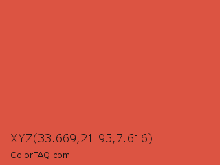 XYZ 33.669,21.95,7.616 Color is a normal red color and the nearest color is Flame Pea #da5b38. Hex code #dc5442 and RGB value is rgb(220,84,66). In RGB color space, this color is composed of 86% red, 33% green, 26% blue, In CMYK color space, this color is composed of 0% cyan, 62% magenta, 70% yellow , 14% black , In HSL color space, this color has a hue angle of 7° , 69% saturation and 56% lightness.