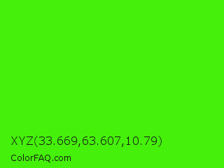 XYZ 33.669,63.607,10.79 Color is a normal green color and the nearest color is Chlorophyll Green #4aff00. Hex code #45f00a and RGB value is rgb(69,240,10). In RGB color space, this color is composed of 27% red, 94% green, 4% blue, In CMYK color space, this color is composed of 71% cyan, 0% magenta, 96% yellow , 6% black , In HSL color space, this color has a hue angle of 105° , 92% saturation and 49% lightness.