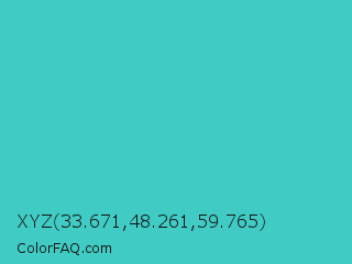 XYZ 33.671,48.261,59.765 Color is a normal cyan color and the nearest color is Medium Turquoise #48d1cc. Hex code #40ccc4 and RGB value is rgb(64,204,196). In RGB color space, this color is composed of 25% red, 80% green, 77% blue, In CMYK color space, this color is composed of 69% cyan, 0% magenta, 4% yellow , 20% black , In HSL color space, this color has a hue angle of 177° , 58% saturation and 53% lightness.