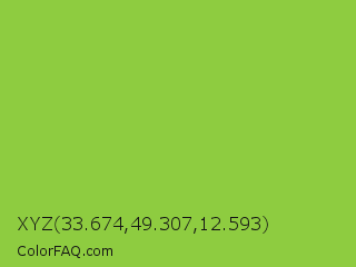 XYZ 33.674,49.307,12.593 Color is a normal green color and the nearest color is Yellow Green #9acd32. Hex code #8ecc40 and RGB value is rgb(142,204,64). In RGB color space, this color is composed of 56% red, 80% green, 25% blue, In CMYK color space, this color is composed of 30% cyan, 0% magenta, 69% yellow , 20% black , In HSL color space, this color has a hue angle of 87° , 58% saturation and 53% lightness.