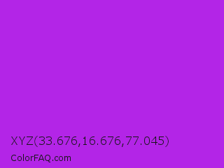 XYZ 33.676,16.676,77.045 Color is a normal purple color and the nearest color is Veronica #a020f0. Hex code #b325e7 and RGB value is rgb(179,37,231). In RGB color space, this color is composed of 70% red, 15% green, 91% blue, In CMYK color space, this color is composed of 23% cyan, 84% magenta, 0% yellow , 9% black , In HSL color space, this color has a hue angle of 284° , 80% saturation and 53% lightness.