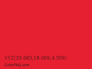 XYZ 33.683,18.069,4.509 Color is a normal red color and the nearest color is Alizarin Crimson #e32636. Hex code #e62030 and RGB value is rgb(230,32,48). In RGB color space, this color is composed of 90% red, 13% green, 19% blue, In CMYK color space, this color is composed of 0% cyan, 86% magenta, 79% yellow , 10% black , In HSL color space, this color has a hue angle of 355° , 80% saturation and 51% lightness.