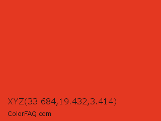XYZ 33.684,19.432,3.414 Color is a normal red color and the nearest color is Vermilion #d9381e. Hex code #e43821 and RGB value is rgb(228,56,33). In RGB color space, this color is composed of 89% red, 22% green, 13% blue, In CMYK color space, this color is composed of 0% cyan, 75% magenta, 86% yellow , 11% black , In HSL color space, this color has a hue angle of 7° , 78% saturation and 51% lightness.