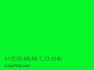XYZ 33.69,66.7,13.018 Color is a normal green color and the nearest color is Green #00ff00. Hex code #05f727 and RGB value is rgb(5,247,39). In RGB color space, this color is composed of 2% red, 97% green, 15% blue, In CMYK color space, this color is composed of 98% cyan, 0% magenta, 84% yellow , 3% black , In HSL color space, this color has a hue angle of 128° , 96% saturation and 49% lightness.