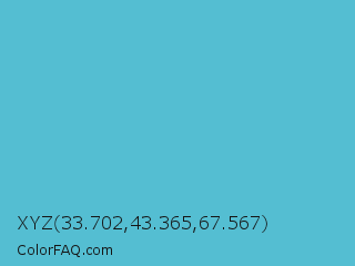 XYZ 33.702,43.365,67.567 Color is a normal cyan color and the nearest color is Sea Serpent #4bc7cf. Hex code #54bed2 and RGB value is rgb(84,190,210). In RGB color space, this color is composed of 33% red, 75% green, 82% blue, In CMYK color space, this color is composed of 60% cyan, 10% magenta, 0% yellow , 18% black , In HSL color space, this color has a hue angle of 190° , 58% saturation and 58% lightness.