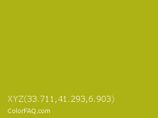 XYZ 33.711,41.293,6.903 Color is a normal yellow color and the nearest color is Acid Green #b0bf1a. Hex code #aeb315 and RGB value is rgb(174,179,21). In RGB color space, this color is composed of 68% red, 70% green, 8% blue, In CMYK color space, this color is composed of 3% cyan, 0% magenta, 88% yellow , 30% black , In HSL color space, this color has a hue angle of 62° , 79% saturation and 39% lightness.