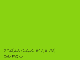 XYZ 33.712,51.947,8.78 Color is a normal green color and the nearest color is Sheen Green #8fd400. Hex code #89d311 and RGB value is rgb(137,211,17). In RGB color space, this color is composed of 54% red, 83% green, 7% blue, In CMYK color space, this color is composed of 35% cyan, 0% magenta, 92% yellow , 17% black , In HSL color space, this color has a hue angle of 83° , 85% saturation and 45% lightness.