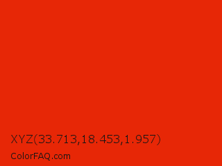 XYZ 33.713,18.453,1.957 Color is a normal red color and the nearest color is Ferrari Red #ff2800. Hex code #e72706 and RGB value is rgb(231,39,6). In RGB color space, this color is composed of 91% red, 15% green, 2% blue, In CMYK color space, this color is composed of 0% cyan, 83% magenta, 97% yellow , 9% black , In HSL color space, this color has a hue angle of 9° , 95% saturation and 46% lightness.