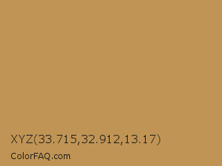 XYZ 33.715,32.912,13.17 Color is a normal orange color and the nearest color is Aztec Gold #c39953. Hex code #bf9455 and RGB value is rgb(191,148,85). In RGB color space, this color is composed of 75% red, 58% green, 33% blue, In CMYK color space, this color is composed of 0% cyan, 23% magenta, 55% yellow , 25% black , In HSL color space, this color has a hue angle of 36° , 45% saturation and 54% lightness.