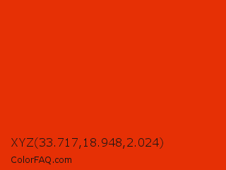 XYZ 33.717,18.948,2.024 Color is a normal red color and the nearest color is Coquelicot #ff3800. Hex code #e63005 and RGB value is rgb(230,48,5). In RGB color space, this color is composed of 90% red, 19% green, 2% blue, In CMYK color space, this color is composed of 0% cyan, 79% magenta, 98% yellow , 10% black , In HSL color space, this color has a hue angle of 11° , 96% saturation and 46% lightness.
