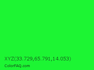 XYZ 33.729,65.791,14.053 Color is a normal green color and the nearest color is Neon Green #39ff14. Hex code #1cf533 and RGB value is rgb(28,245,51). In RGB color space, this color is composed of 11% red, 96% green, 20% blue, In CMYK color space, this color is composed of 89% cyan, 0% magenta, 79% yellow , 4% black , In HSL color space, this color has a hue angle of 126° , 92% saturation and 54% lightness.