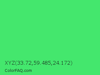 XYZ 33.72,59.485,24.172 Color is a normal green color and the nearest color is UFO Green #3cd070. Hex code #44e76d and RGB value is rgb(68,231,109). In RGB color space, this color is composed of 27% red, 91% green, 43% blue, In CMYK color space, this color is composed of 71% cyan, 0% magenta, 53% yellow , 9% black , In HSL color space, this color has a hue angle of 135° , 77% saturation and 59% lightness.