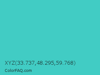 XYZ 33.737,48.295,59.768 Color is a normal cyan color and the nearest color is Medium Turquoise #48d1cc. Hex code #41ccc4 and RGB value is rgb(65,204,196). In RGB color space, this color is composed of 25% red, 80% green, 77% blue, In CMYK color space, this color is composed of 68% cyan, 0% magenta, 4% yellow , 20% black , In HSL color space, this color has a hue angle of 177° , 58% saturation and 53% lightness.