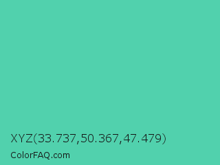 XYZ 33.737,50.367,47.479 Color is a normal green color and the nearest color is Eucalyptus #44d7a8. Hex code #51d1ad and RGB value is rgb(81,209,173). In RGB color space, this color is composed of 32% red, 82% green, 68% blue, In CMYK color space, this color is composed of 61% cyan, 0% magenta, 17% yellow , 18% black , In HSL color space, this color has a hue angle of 163° , 58% saturation and 57% lightness.