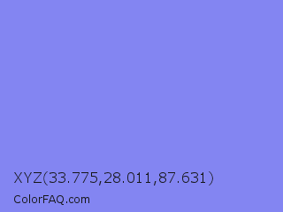 XYZ 33.775,28.011,87.631 Color is a light blue color and the nearest color is Chetwode Blue #8581d9. Hex code #8385f2 and RGB value is rgb(131,133,242). In RGB color space, this color is composed of 51% red, 52% green, 95% blue, In CMYK color space, this color is composed of 46% cyan, 45% magenta, 0% yellow , 5% black , In HSL color space, this color has a hue angle of 239° , 81% saturation and 73% lightness.