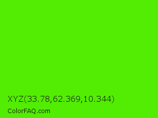 XYZ 33.78,62.369,10.344 Color is a normal green color and the nearest color is Chlorophyll Green #4aff00. Hex code #52ed03 and RGB value is rgb(82,237,3). In RGB color space, this color is composed of 32% red, 93% green, 1% blue, In CMYK color space, this color is composed of 65% cyan, 0% magenta, 99% yellow , 7% black , In HSL color space, this color has a hue angle of 100° , 98% saturation and 47% lightness.