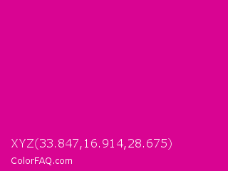 XYZ 33.847,16.914,28.675 Color is a normal magenta color and the nearest color is Mexican Pink #e4007c. Hex code #d90492 and RGB value is rgb(217,4,146). In RGB color space, this color is composed of 85% red, 2% green, 57% blue, In CMYK color space, this color is composed of 0% cyan, 98% magenta, 33% yellow , 15% black , In HSL color space, this color has a hue angle of 320° , 96% saturation and 43% lightness.