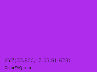 XYZ 33.866,17.03,81.623 Color is a normal purple color and the nearest color is Veronica #a020f0. Hex code #af2ced and RGB value is rgb(175,44,237). In RGB color space, this color is composed of 69% red, 17% green, 93% blue, In CMYK color space, this color is composed of 26% cyan, 81% magenta, 0% yellow , 7% black , In HSL color space, this color has a hue angle of 281° , 84% saturation and 55% lightness.