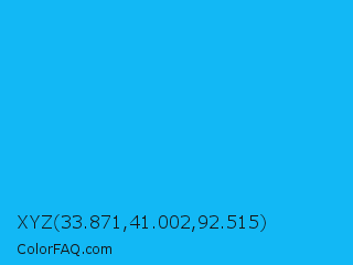 XYZ 33.871,41.002,92.515 Color is a normal blue color and the nearest color is Spiro Disco Ball #0fc0fc. Hex code #12b8f5 and RGB value is rgb(18,184,245). In RGB color space, this color is composed of 7% red, 72% green, 96% blue, In CMYK color space, this color is composed of 93% cyan, 25% magenta, 0% yellow , 4% black , In HSL color space, this color has a hue angle of 196° , 92% saturation and 52% lightness.