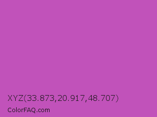 XYZ 33.873,20.917,48.707 Color is a normal magenta color and the nearest color is Fuchsia Pink #c154c1. Hex code #c152ba and RGB value is rgb(193,82,186). In RGB color space, this color is composed of 76% red, 32% green, 73% blue, In CMYK color space, this color is composed of 0% cyan, 58% magenta, 4% yellow , 24% black , In HSL color space, this color has a hue angle of 304° , 47% saturation and 54% lightness.