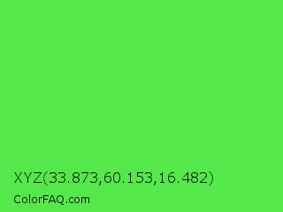 XYZ 33.873,60.153,16.482 Color is a normal green color and the nearest color is Screamin Green #66ff66. Hex code #55e84b and RGB value is rgb(85,232,75). In RGB color space, this color is composed of 33% red, 91% green, 29% blue, In CMYK color space, this color is composed of 63% cyan, 0% magenta, 68% yellow , 9% black , In HSL color space, this color has a hue angle of 116° , 77% saturation and 60% lightness.