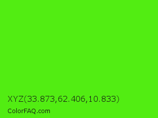 XYZ 33.873,62.406,10.833 Color is a normal green color and the nearest color is Chlorophyll Green #4aff00. Hex code #52ed12 and RGB value is rgb(82,237,18). In RGB color space, this color is composed of 32% red, 93% green, 7% blue, In CMYK color space, this color is composed of 65% cyan, 0% magenta, 92% yellow , 7% black , In HSL color space, this color has a hue angle of 102° , 86% saturation and 50% lightness.