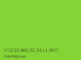 XYZ 33.882,52.34,11.807 Color is a normal green color and the nearest color is Kiwi #8ee53f. Hex code #85d436 and RGB value is rgb(133,212,54). In RGB color space, this color is composed of 52% red, 83% green, 21% blue, In CMYK color space, this color is composed of 37% cyan, 0% magenta, 75% yellow , 17% black , In HSL color space, this color has a hue angle of 90° , 65% saturation and 52% lightness.